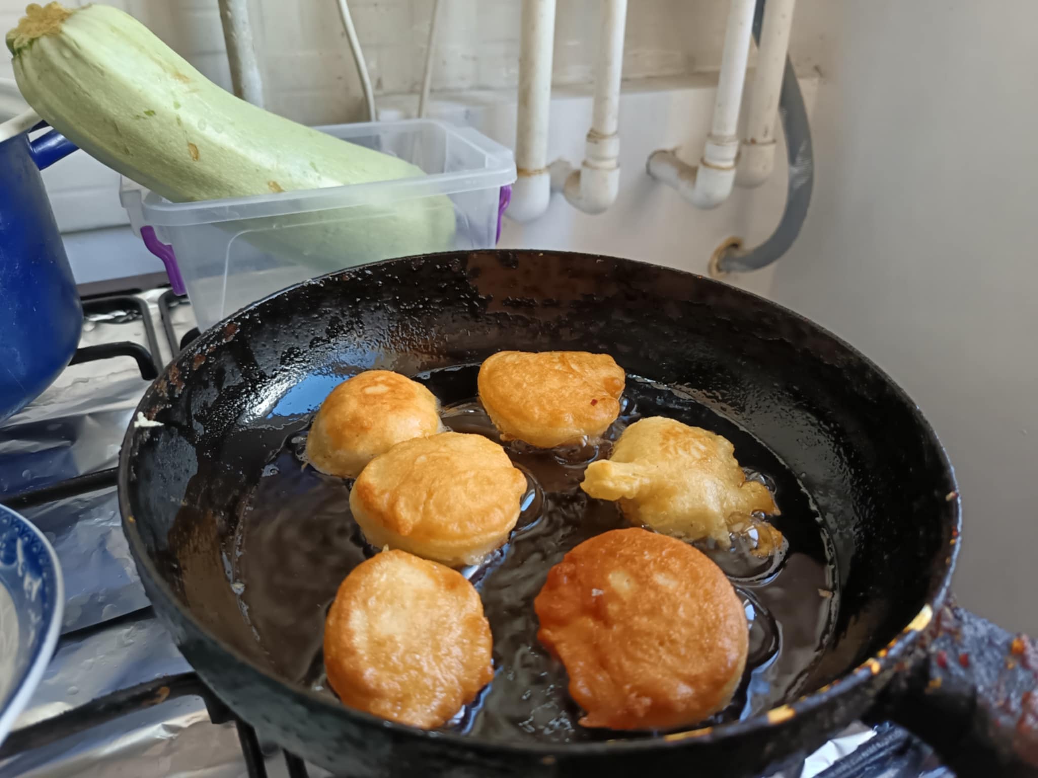 Cu ajutorul unei linguri, am luat bucăți din aluat și le-am prăjit în uleiul încins până au devenit aurii.