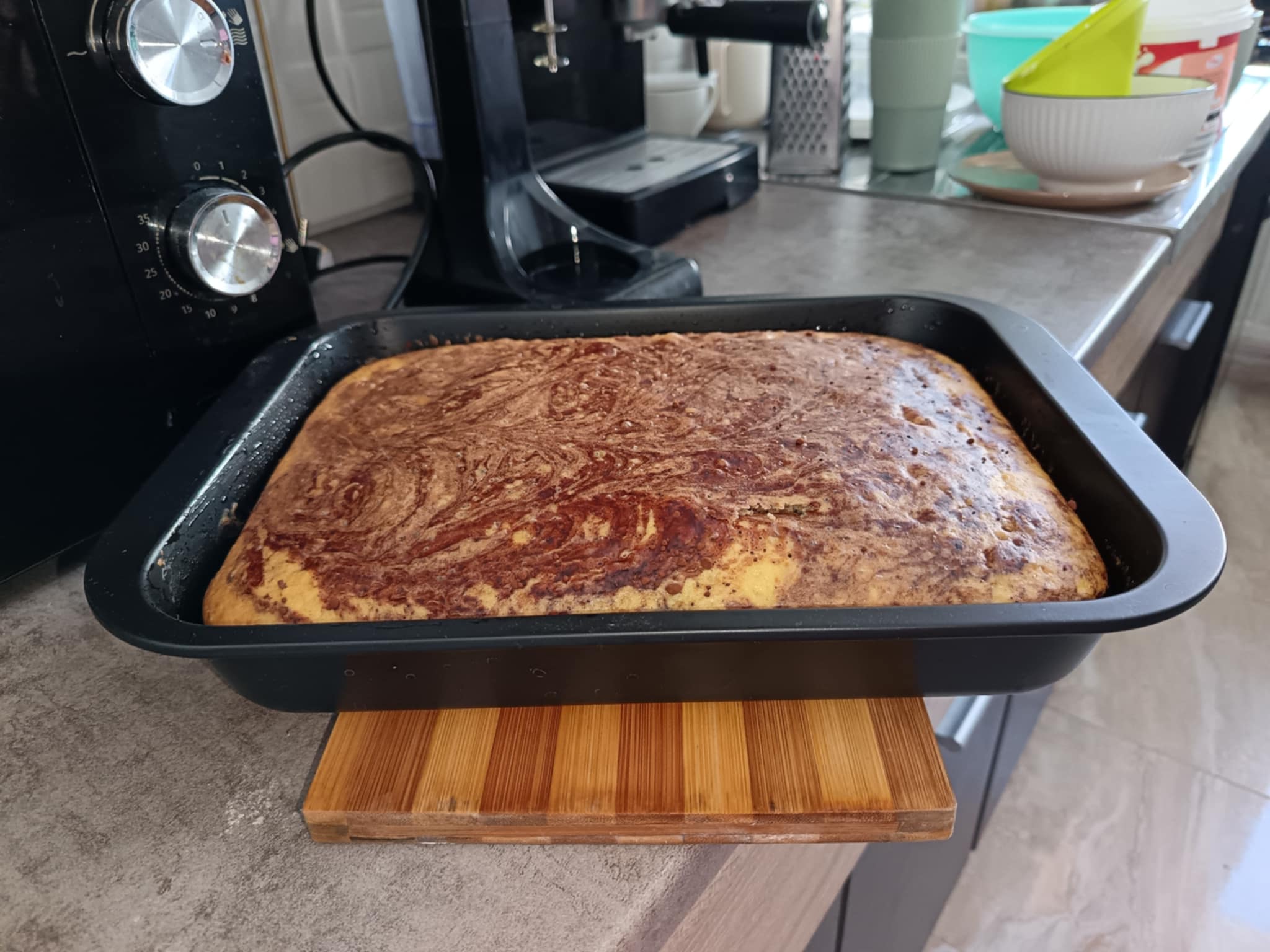 După ce s-a copt, lasă pandispanul să se răcească în tavă pentru câteva minute, apoi îl poți transfera pe un suport de răcire. Tăiat în felii, va fi perfect pentru orice ocazie!