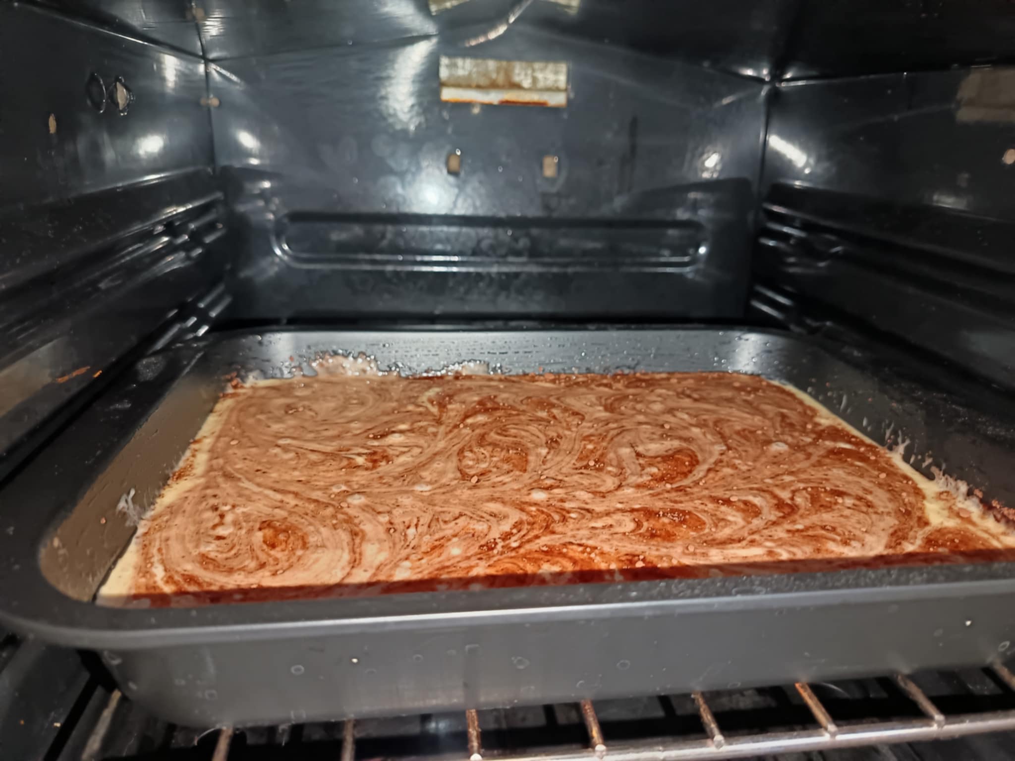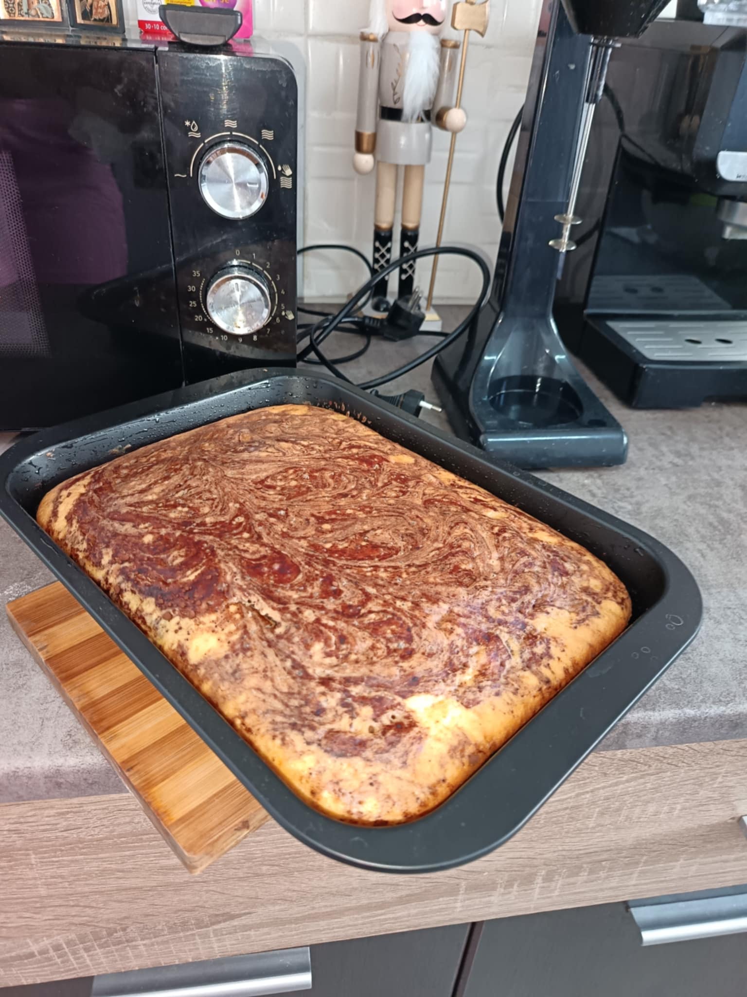 Toarnă compoziția în tavă. Apoi, folosește cacao pentru a crea modele decorative pe deasupra. Poți face desene simple sau orice îți dorești folosind o furculiță.